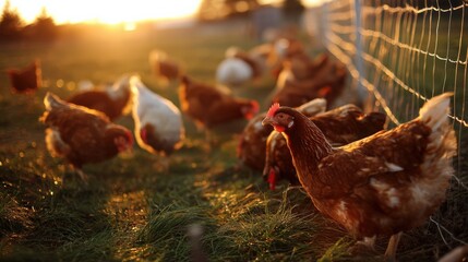 Sunrise casts a warm glow on chickens grazing freely in open pasture, raised ethically for nutrient-rich eggs in rural.