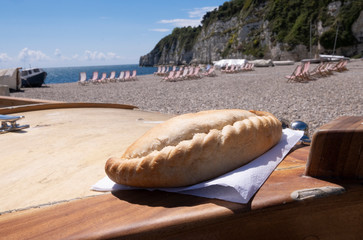 Cornish pasty on boat , beach location in West Country in summer with deck chairs and fishing boat