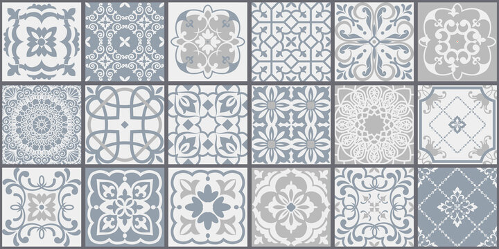 Collection of 18 ceramic tiles in turkish style. Seamless colorful patchwork from Azulejo tiles. Portuguese and Spain decor. Islam, Arabic, Indian, Ottoman motif. Vector Hand drawn background