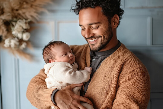 A touching and sincere close-up portrait of father and son. Fatherhood beyond stereotypes. Father's day concept.