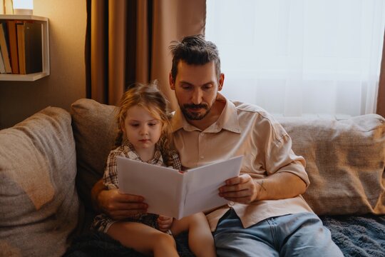 A young father comforts his 4-year-old daughter while reading her a book, sharing a tender moment of paternal love and emotional connection
