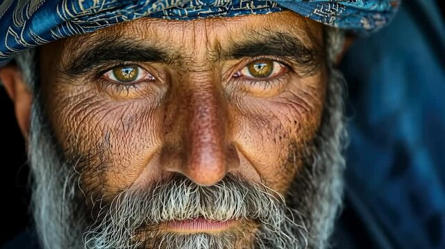 Close-up portrait of an elderly afghan man with a traditional turban and grey beard, conveying wisdom and cultural heritage