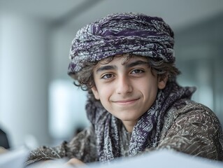 A young boy with curly hair wea a traditional turban and patterned clothing smiles looking at the camera.