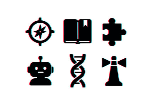 six different glitch effect illustration isolated on white backgorund curiosity pathfinder compass curiosity research journal curiosity puzzle piece curiosity AI chatbot curiosity DNA