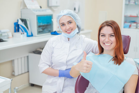 Happy women a dentist and patient after treating teeth at the dental office, smiling and looking towards the camera. Happy patient shows thumb as an endorsement. Dental equipment.
