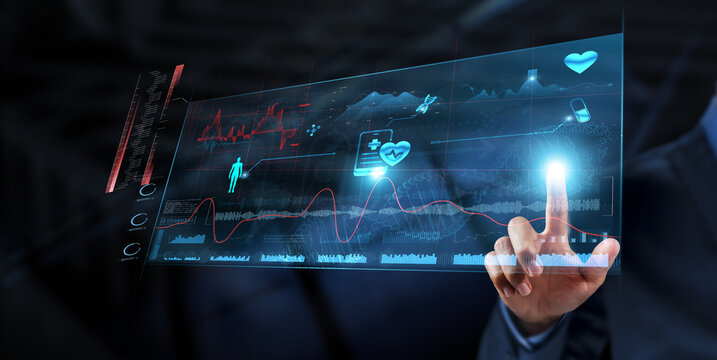 Telehealth: Businessman analyzes data strategy with graph on digital screen. Remote monitoring, patient engagement, virtual consultations, health data security, cost reduction, technology integration.