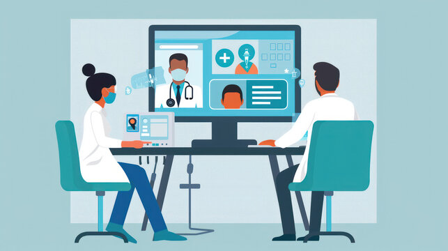 A healthcare business meeting focused on innovations in telemedicine, with professionals discussing digital healthcare tools and patient management systems.
