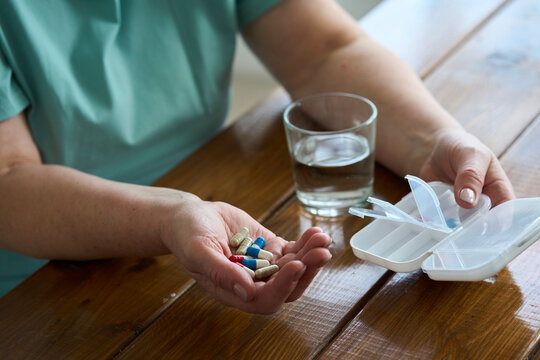 Senior woman discussing her medication routine with her home nurse, pill organizer on the table, Elderly woman, home nurse, medication routine