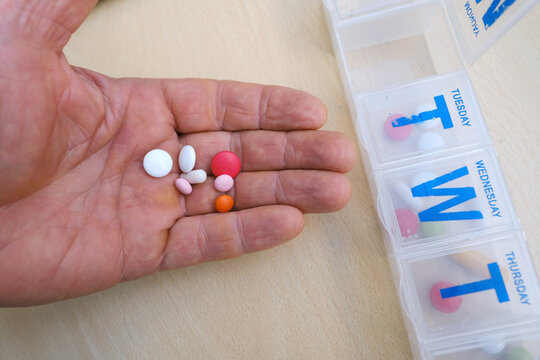 Pill box daily take a medicine, with colorful of pills, tablets, and capsules. Drugs use for treatment and cure the disease.