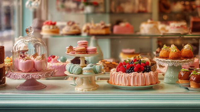 Elegant Parisian patisserie display with colorful cakes, macarons, and berries in vintage bakery