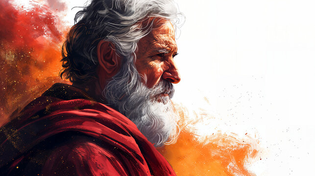 A powerful portrait of a figure reminiscent of the biblical Moses, with a red cloak and a determined expression, in a vivid, painterly style.