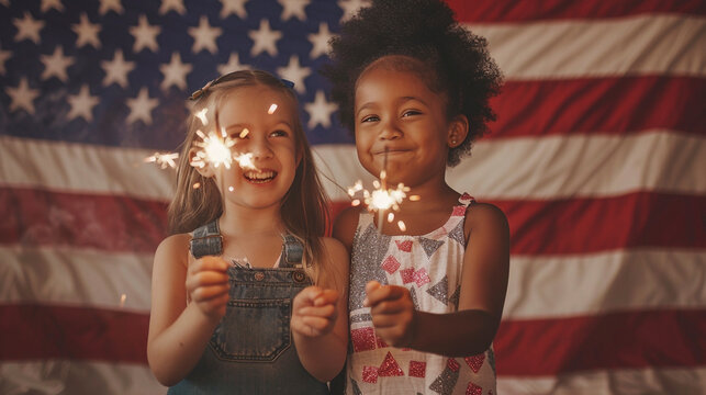 happy children holding a sparkler with the American flag in the backdrop