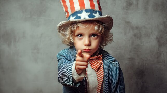 Young boy dressed in patriotic attire pointing. Stars and stripes hat. Red, white, and blue bow tie. Assertive and patriotic.