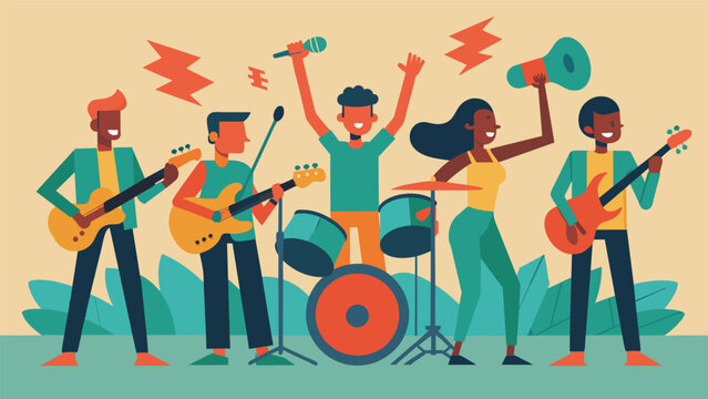The sound of guitars and tambourines fill the air as a local band takes the stage inviting everyone to join in on the celebration.. Vector illustration