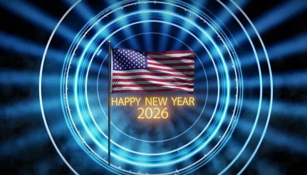 US flag waves with Happy New Year 2026 text and blue animated circles