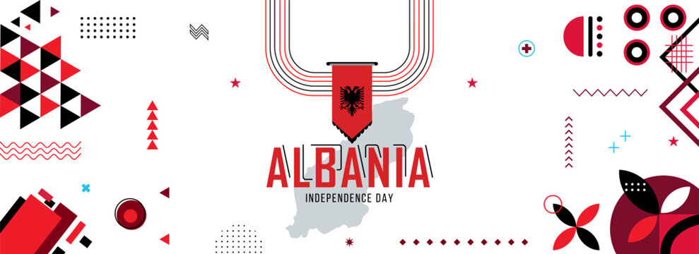 Map and flag of Albania national or independance day banner with raised hands or fists., flag colors theme background and geometric abstract retro modern colorfull design