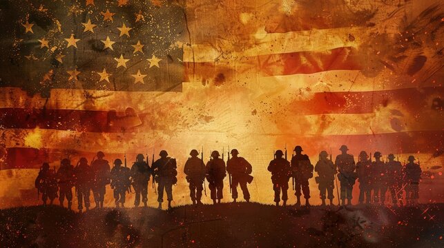 Silhouettes of Soldiers Standing in Front of an American Flag Illustration