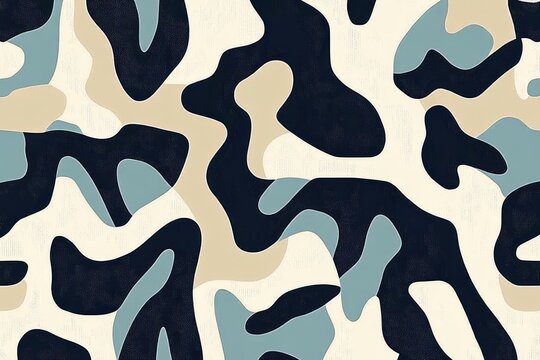 soft abstract camouflage pattern of organic navy, beige, and muted blue shapes on a cream background conveying calm modern rhythm