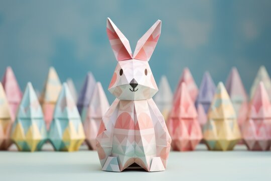 Origami Easter bunny with patterned paper and pastel eggs
