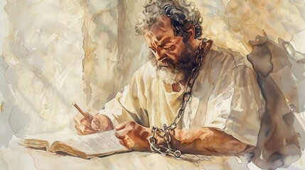 Apostle Paul in Chains Writing Letters from Prison Biblical Illustration on Beige Background with Copyspace Ideal for Religious Content