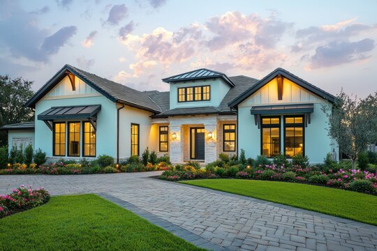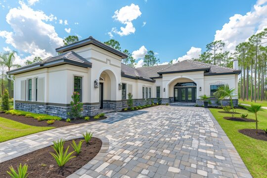 A beautifully maintained driveway leads up to a luxury house surrounded by lush greenery, showcasing meticulously laid pavers and vibrant landscaping