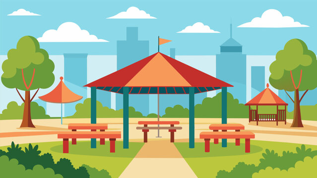 Gazebo or pavilion in a park with some seating and tables providing shade and rest