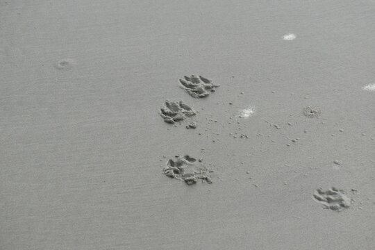 Dog pawprints in wet sand on beach with dog silhouette in background, natural outdoor scenery symbolizing adventure, companionship and coastal wilderness exploration