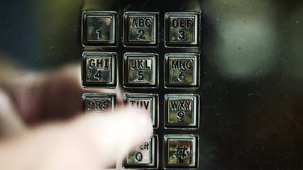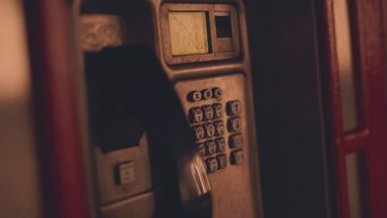 A vintage payphone booth glows with a mysterious red neon light on a dark, graffiti-covered brick wall in an urban street at night