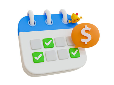 3d minimal payday concept. payment date. calendar with a dollar sign and bell icon. 3d illustration.