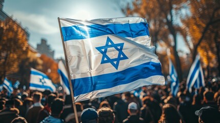 A large gathering of people in an urban park proudly waving Israeli flags under a bright sky filled with autumn leaves, celebrating unity and culture