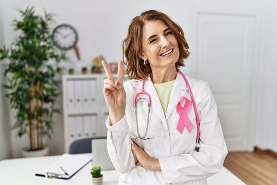Middle age doctor woman wearing pink cancer ribbon on uniform smiling with happy face winking at the camera doing victory sign with fingers. number two.