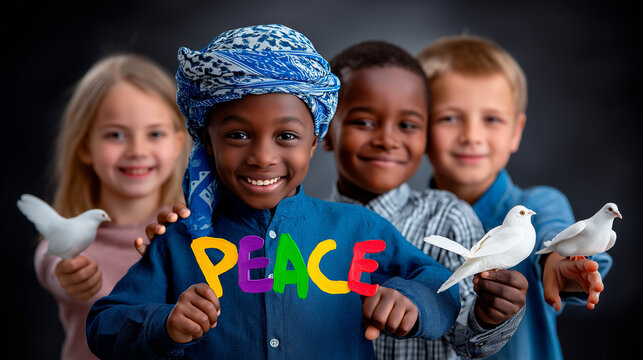 Children Uniting for Global Peace with Doves and Peace Signs
