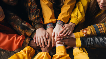 Hands of different ethnicities united in a circle, showcasing the power of global unity and peace Generative AI