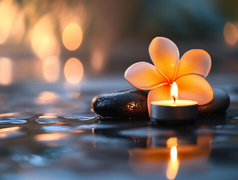 Frangipani flower, hot stones and candle in soft spa lighting with massage room background, tropical ambiance symbolizing Balinese relaxation, holistic therapy and wellness in a peaceful setting with