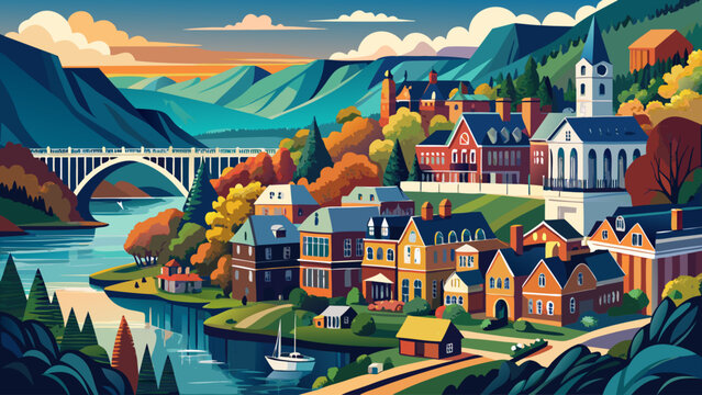 Very beautiful scenic view of Harpers Ferry, nestled between rivers and mountains, layered landscape depth, historic charm, and peaceful atmosphere rendered in vector illustration.
