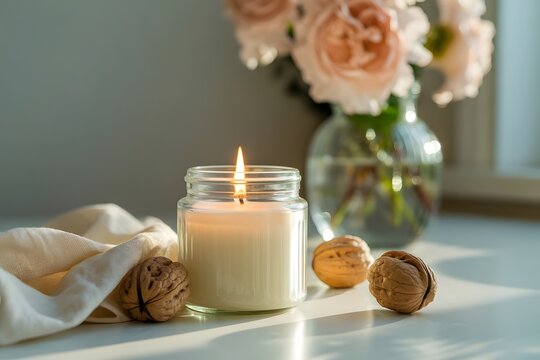 Warm candlelight creates a peaceful ambiance against a dark backdrop, its gentle flame flickering softly, offering a sense of serenity and tranquility