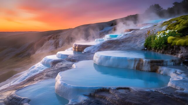 Cascading hot spring pools on limestone slope at sunset – Great for health tourism, wellness imagery, or geothermal destination marketing.