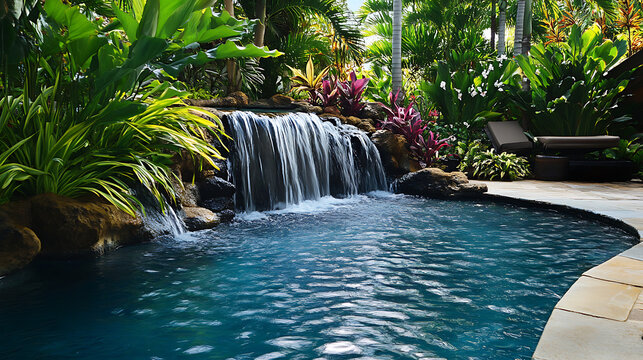 Serene waterfall in lush bamboo garden, tranquil scene, nature background, relaxation