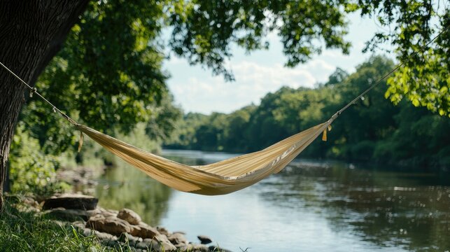 Riverbank hammock relaxation, summer nature scene, peaceful getaway