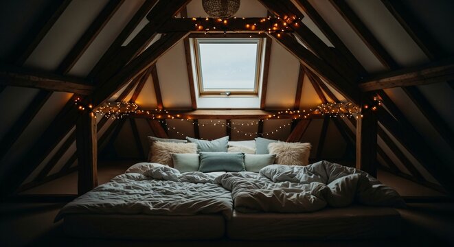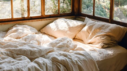 Comfortable Window Seat with Pillows and Knit Blanket Against Blurred Rainy Cityscape