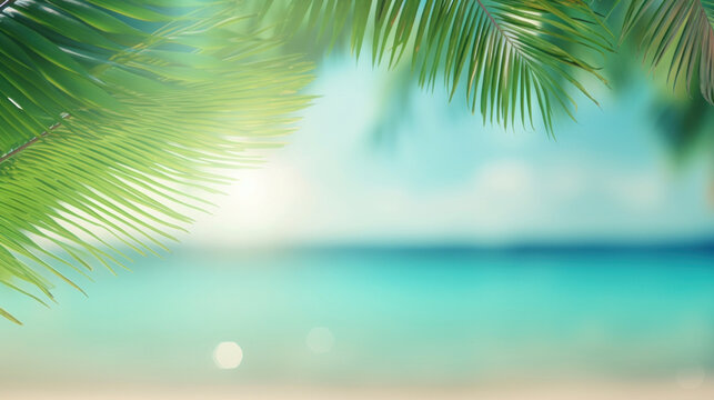The silhouetted palm leaves frame a tranquil view of a turquoise ocean, embodying a serene tropical atmosphere.