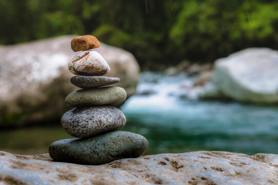 Rocks stacked in balance in a peaceful rainforest on the side of a river in a national park of Costa Rica