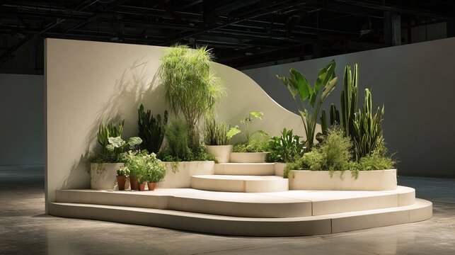 Serene modern indoor oasis with lush plants and elegant curved architecture creates peaceful urban sanctuary