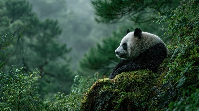 Giant panda resting on mossy rock in bamboo forest, a moment of peace in nature's embrace