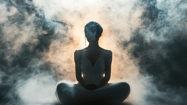 Person meditating in smoke cloud background with soft light creating peaceful tranquil inner reflection