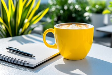 Notebook, pen, and plant on a sunlit wooden desk.  A peaceful workspace.