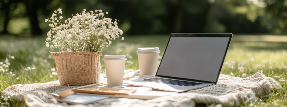 Bright home office workspace with natural light, large glass windows, greenery, wooden desk, computer monitor, cozy modern interior, plants, productivity, peaceful environment