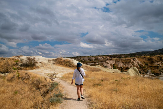 Woman walking on a hill under cloudy skies in Cappadocia