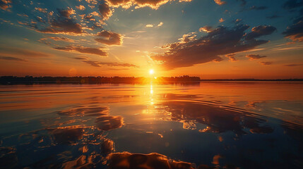 A sun-kissed water scene with a mirrored sun, dotted with wispy clouds. Suitable for travel and tourism promotions or relaxation and meditation themes.