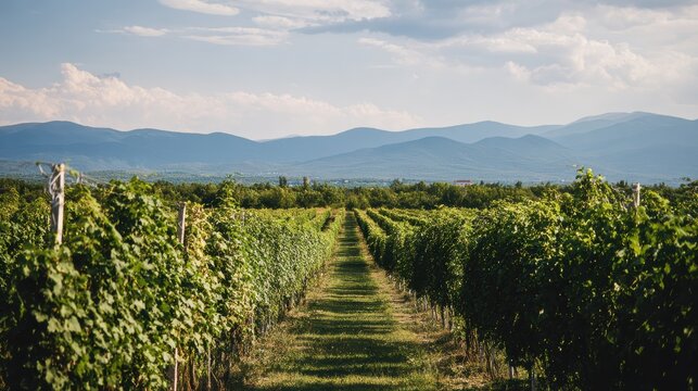Vineyard scene with neat rows of vines bathed in sunlight, perfect for wine promotions, travel brochures, or peaceful countryside graphics.